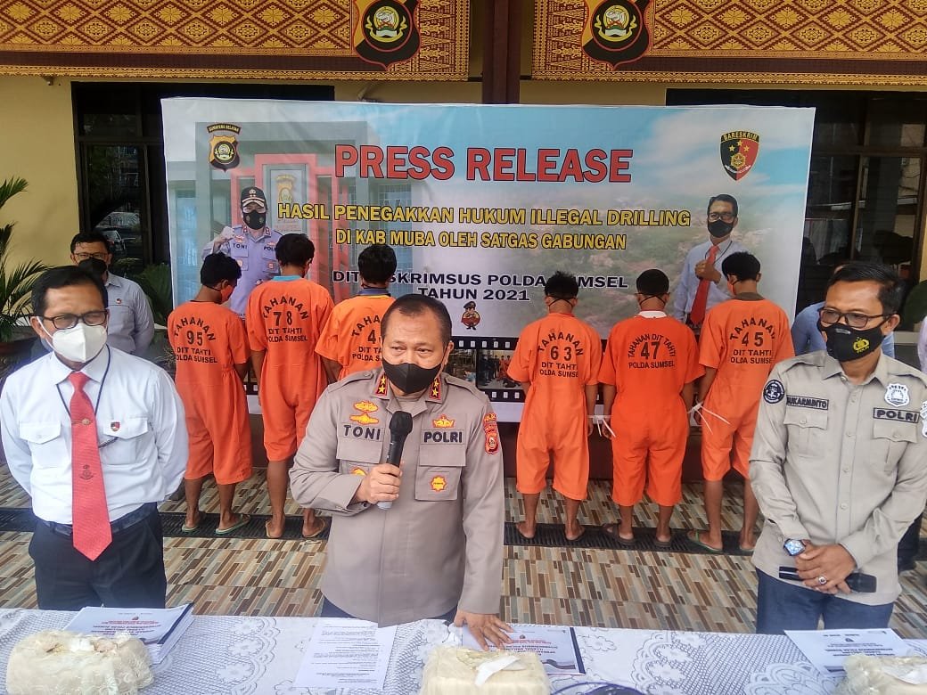 “Dalam menegakan hukum kami mengajak Forum Koordinasi Pimpinan Daerah (Forkopimda) dan tidak akan berhenti sampai di enam pelaku ini saja, bahkan jumlah sumur pun akan diprediksikan akan bertambah untuk itu kita harus mengupas tuntas kasus ini,” katanya didampingi Direktur Reserse Kriminal Khusus Polda Sumsel Kombes Pol Barly Ramadhany ,Kasubbid Mulmed Kompol Sukarminto dan Kasubdit IV Rahmat Sihotang Kamis (7/10/2021).