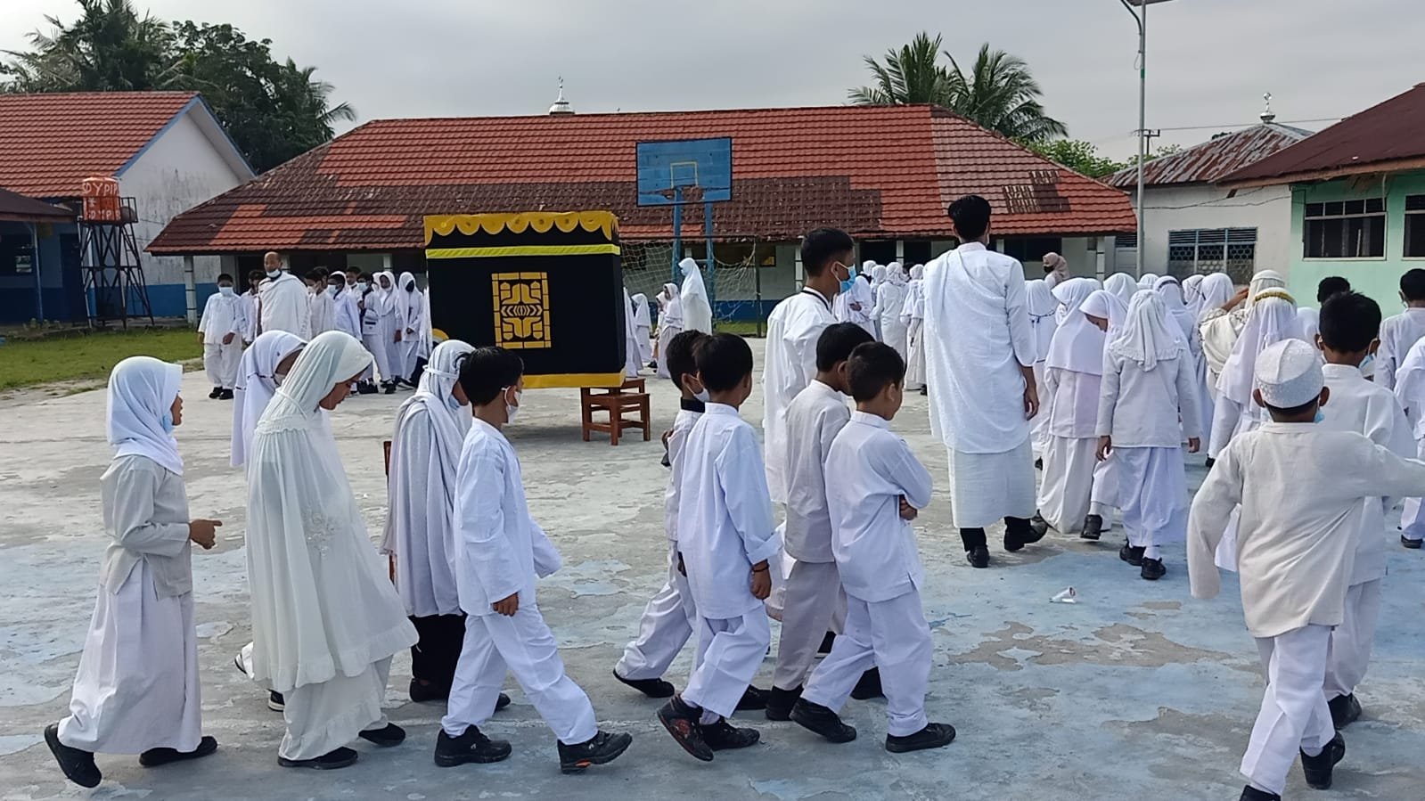 Kalimat tauhid atau bacaan talbiyah pun menggema di halaman sekolah SD YPIP Peris Pendopo.