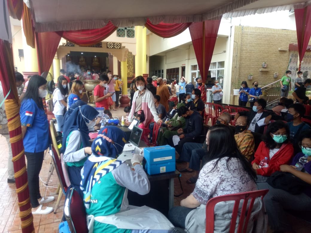 Dalam gelaran vaksinasi Covid-19 di Vihara Dharmakirti terlihat ratusan masyarakat antusias mengikuti Vaksin. Bahkan, anak-anak ikut Vaksin di dampingi orang tuanya.