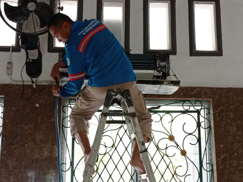 Bakti sosial tersebut berupa pembersihan AC di Rumah Ibadah yang hari ini dilaksanakan di 4 tempat salah satunya di Masjid Jami’ Amaliah Jalan Kemang Manis Ilir Barat I Palembang.