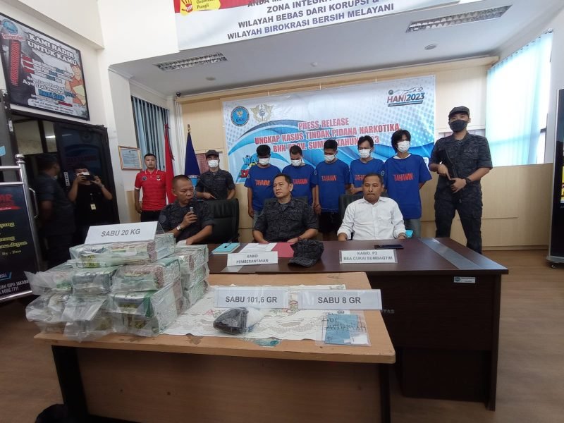 HALOPOS.ID|PALEMBANG, – Badan Narkotika Nasional (BNN) Provinsi Sumsel menggelar pers rilis penggagalan pengiriman 20 kilogram sabu asal Malaysia menuju Kota Palembang, Jum’at (23/6/2023).