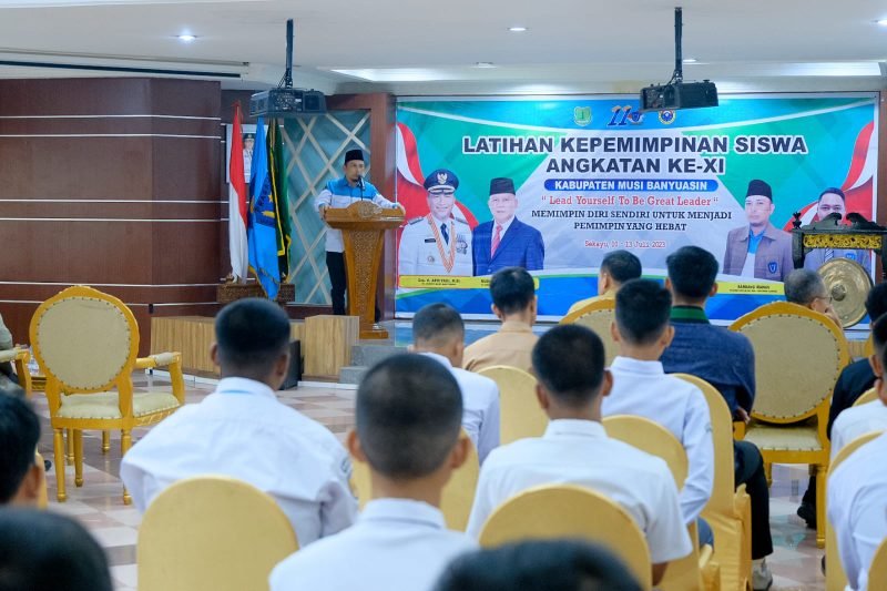 HALOPOS.ID|MUBA- Pj Bupati Muba H Apriyadi Mahmud diwakili Kepala bidang (Kabid) Paud dan TK Dinas pendidikan dan Kebudayaan Kabupaten Muba Drs RR Gunawan MM membuka secara latihan kepemimpinan siswa angkatan ke XI Kabupaten Muba yang berlangsung di Auditorium Pemkab Muba, Senin (10/07/2023).