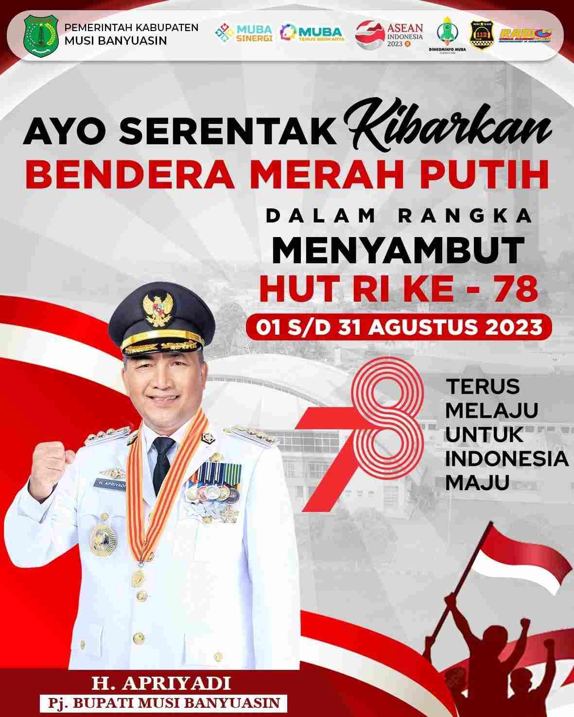 HALOPOS.ID|MUBA- Pj Bupati Muba H Apriyadi sangat antusias menyambut dan menyemarakkan peringatan HUT ke-78 Kemerdekaan Republik Indonesia Tahun 2023 di wilayah Kabupaten Musi Banyuasin mengajak dan menghimbau masyarakat untuk memasang bendera merah putih.