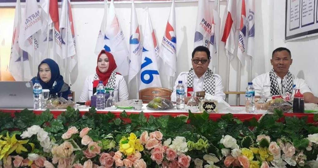 Tampak Febuar Rahman dan pengurus partai Perindo lainnya mengenakan sal Bendera Palestina saat rapat berlangsung termasuk caleg DPR RI Zulkarnai Adinegara.