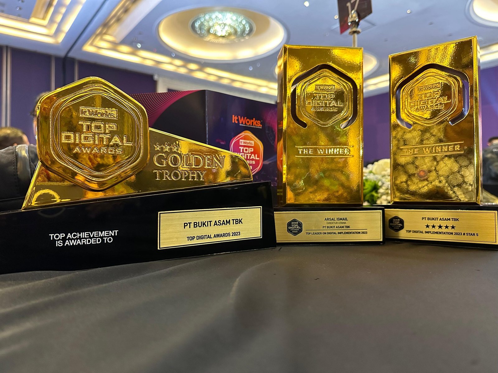 Tiga penghargaan diraih PTBA, yaitu Top Digital Implementation 2023 #Level Stars 5, Golden Star Trophy, dan Top Leader on Digital Implementation 2023 untuk Direktur Utama PT Bukit Asam Tbk (PTBA) Arsal Ismail.