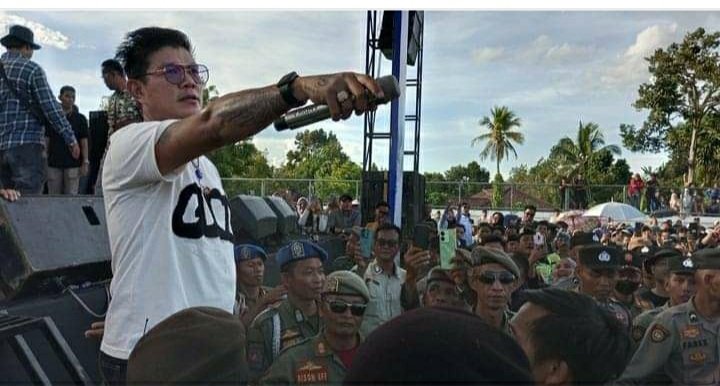 Babang Tamvan mencoba mengajak Bupati OKU Selatan, dan Popo Ali Martopo bersama istri Isyana Lonitasari bernyanyi bersama di atas panggung.