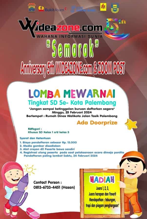 HALOPOS.ID|PALEMBANG – Semarak rangkaian Anniversary 5 tahun WIDEAZONE.com & ZOOM POST [WIZO] menggelar Lomba Mewarnai Tingkat SD se-Kota Palembang dengan mengusung tema ‘Mewarnai Kota Palembang’ yang akan diselenggarakan pada Minggu 25 Februari 2024 mendatang.