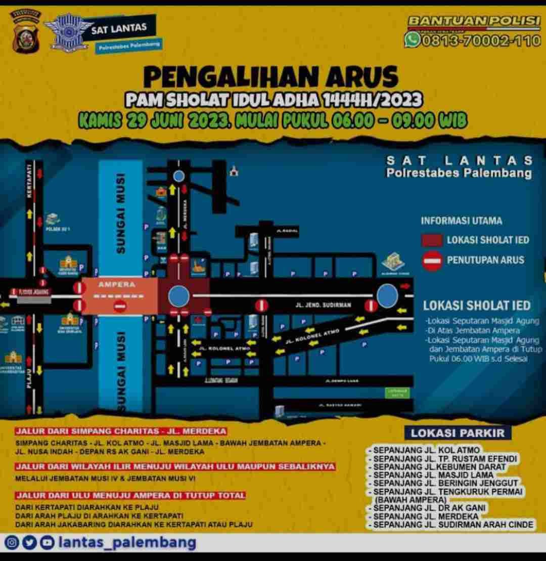 HALOPOS.ID|PALEMBANG – Menjelang Sholat Ied Di Masjid Agung Palembang Satlantas Polrestabes Palembang, mengalihkan arus lalu lintas dan penutupan Jembatan Ampera.