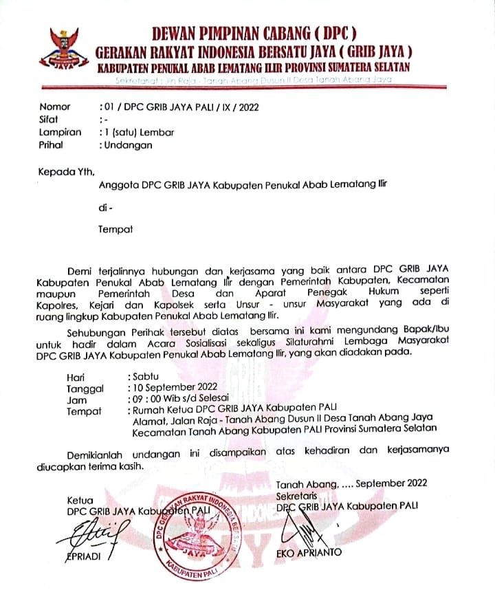 HALOPOS.ID|PALI – Dewan Pimpinan Cabang Gerakan Rakyat Indonesia Bersatu Jaya, (DPC Grib Jaya) Kabupaten Penukal Abab Lematang Ilir (PALI) Provinsi Sumatera Selatan Akan segera mengadakan sosialisasi keberadaan dan domisilinya di Bumi Serepat Serasan.