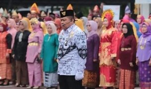 Bertindak sebagai pembina upacara PJ Walikota Palembang Ratu Dewa, Pemimpin dan semua peserta upacara tampak seragam mengenakan baju adat Kota Palembang.