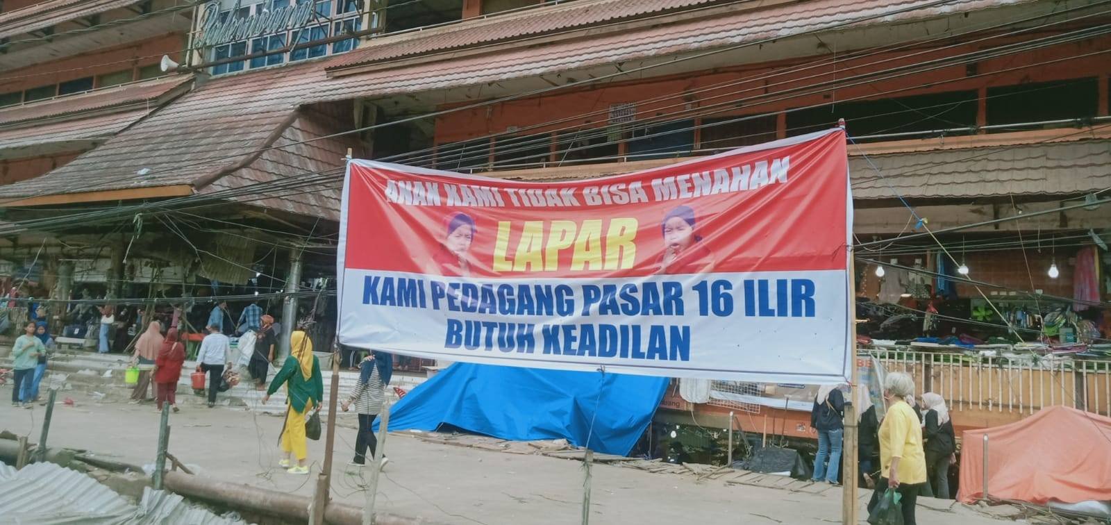 Slogan dalam Spanduk yang dipasang tersebut berbunyi ” Anak Kami Tidak Bisa Menahan Lapar, Kami Pedagang Pasar 16 Ilir Perlu Keadilan”, ratusan Pedagang masih berada dilokasi penggusuran tersebut.