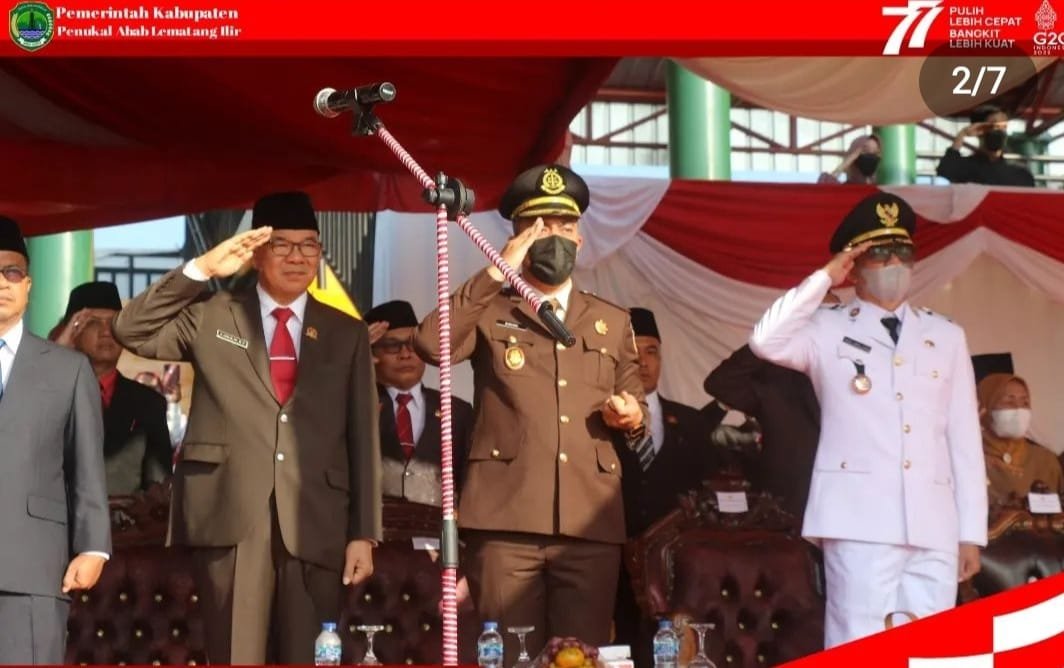 Upacara peringatan HUT RI ke-77 diikuti oleh Bupati PALI DR. Ir. H. Heri Amalindo, MM, Wakil Bupati Drs. H. Soemarjono, Ketua DPRD H. Asri Ag, SH, Sekda, Kejari, Kepala OPD, Danyonmob, Koramil serta jajaran Forkopimda dan tamu undangan lainnya.
