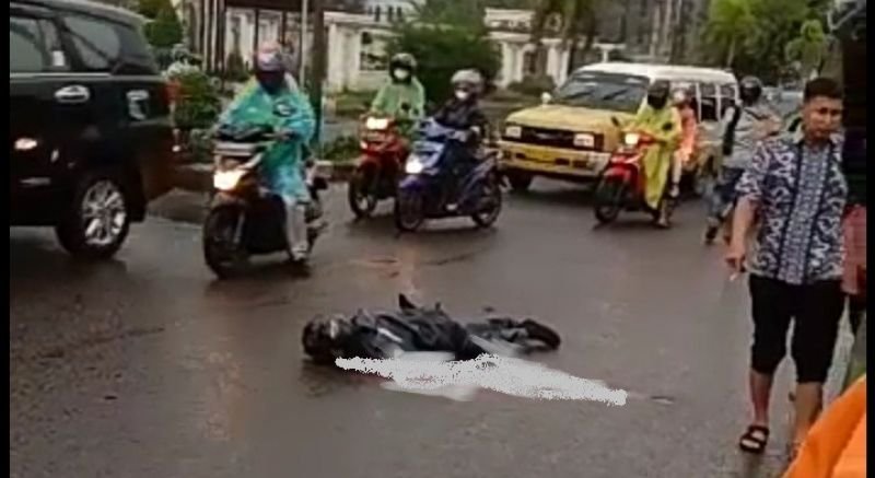 HALOPOS.ID|PALEMBANG – Hujan deras yang mengguyur kota Palembang sejak pagi hari mengakibatkan kecelakaan antara mobil Toyota Kijang Inova dan seorang pengendara motor,