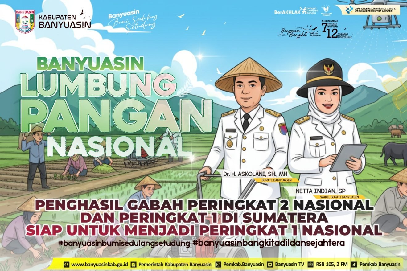 HALOPOS.ID|BANYUASIN – Pemerintah Kabupaten Banyuasin akhirnya menduduki nomor 2 Lumbung Pangan Nasional dengan produksi padi terbesar di Indonesia sebanyak 1.163.416 ton/GKG mengungguli Kabupaten Karawang Provinsi Jawa Barat dengan produksi padi sebesar 911.565 ton/GKG dan dibawah Kabupaten Indramayu Provinsi Jawa Barat dengan produksi padi 1.253.718 ton/GKG.